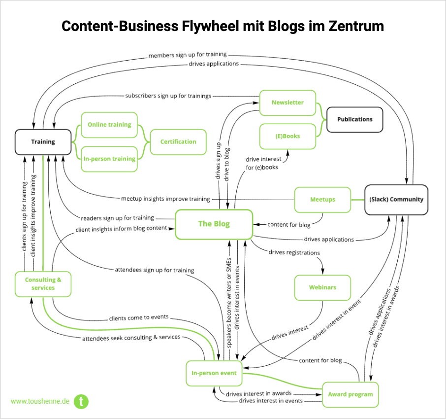 Was heißt das für uns als Content-Schaffende? Im Grunde, dass wir daraus ein Business ähnlich wie klassische Media Brands aufbauen können. So oder so ähnlich sieht das Flywheel typischer Media Brands aus: