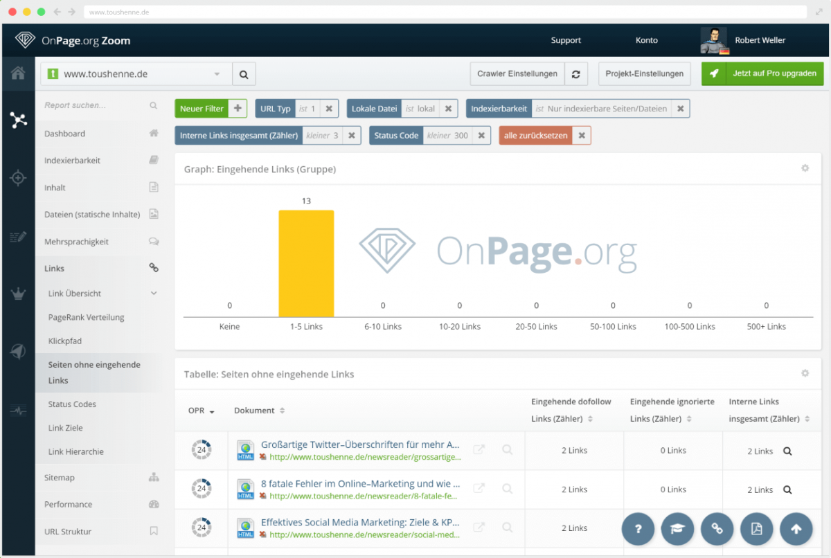 - Du solltest deine interne Verlinkung auf kaputte Links prüfen – zum Beispiel mit OnPage.org oder Broken Link Checker – und danach deine Sitemap aktualisieren.