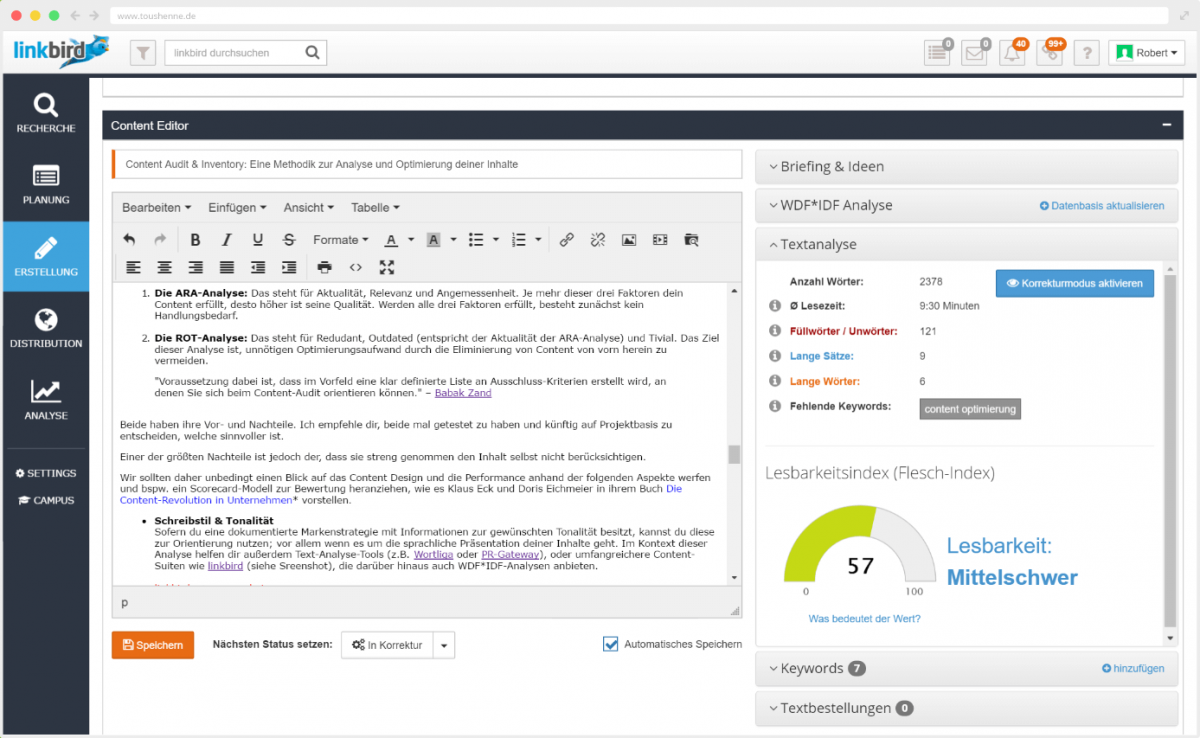 Sofern du eine dokumentierte Markenstrategie mit Informationen zur gewünschten Tonalität besitzt, kannst du diese zur Orientierung nutzen; vor allem wenn es um die sprachliche Präsentation deiner Inhalte geht. Im Kontext dieser Analyse helfen dir außerdem Text-Analyse-Tools (z.B. Wortliga oder PR-Gateway), oder umfangreichere Content-Suiten wie contentbird (siehe Screenshot), die darüber hinaus auch WDF*IDF-Analysen anbieten. - Interne Verlinkung bzw. Integration ins Gesamtbild