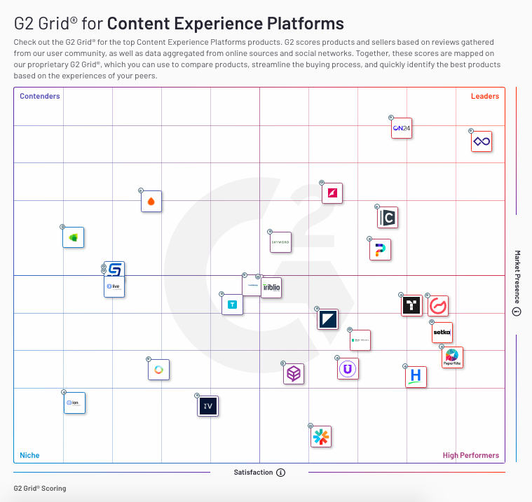 Ein Blick auf den G2 Grid® für Content Experience Plattformen bestätigt die Marken, die bei mir “top of mind” sind (uberflip, PathFactory oder Foleon), schreibt aber auch weitere Namen auf die Agenda. Allen voran den Leader Showpad, die Engagement-Plattformen outgrow und Tiled sowie Ion von rockcontent. Darüber hinaus würde ich noch Marken bzw. Tools wie Adobe Experience Manager oder HubSpot ergänzen.
