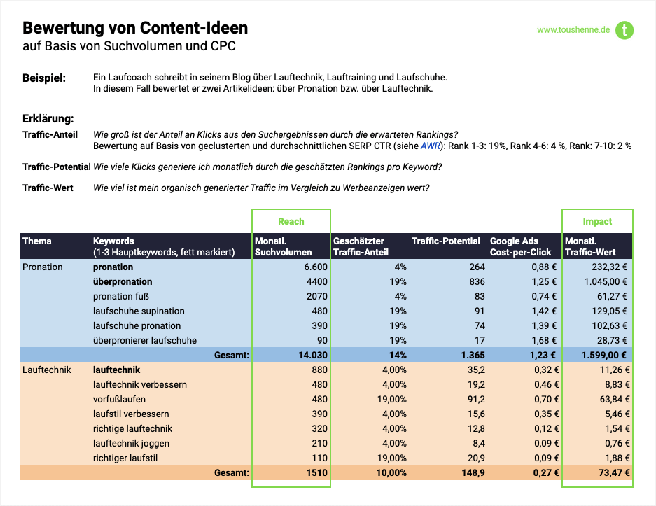 Die Priorisierung kann prinzipiell schon auf dieser Basis des Gesamtwertes einer Content-Idee geschehen (Annahme: Je höher der Traffic Value, desto besser die Idee). Dennoch empfehle ich, im Sinne des RICE Frameworks zusätzlich den Effort (Wie viel Zeit/Geld/etc. müssen wir investieren, um die zugrundeliegenden Rankings tatsächlich zu erreichen und zu halten?) und eine Aussage zur Konfidenz (Wie zuversichtlich sind wir, dass wir mit dem geschätzten Aufwand die zugrundeliegenden Rankings erzielen?) zu ergänzen.