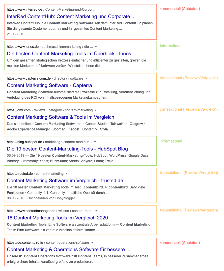 Wichtig: Für sich ist keine dieser Werte aussagekräftig – insbesondere bei der Reichweite dürfen wir uns nicht irreführen lassen. Denn was bringt uns ein hohes Suchvolumen (SV), das wir nicht abgreifen können, weil die Konkurrenz (ergo der notwendige Effort für Spitzenrankings) zu hoch ist? Zudem sollten wir auch darauf achten, die richtigen Keywords zu berücksichtigen. Die Suchintention² ist ausschlaggebend für die Wahl der Suchbegriffe. Oft sind Longtail Keywords mit einem sogenanntem “commercial intent” aber niedrigem Suchvolumen profitabler als Shorthead Keywords mit hohem Suchvolumen und einem generellen oder “informational intent”. Ein Blick in die Suchergebnisse hilft zur Orientierung, denn auf Basis der Ergebnisse können wir oft auf die Suchintention schließen: