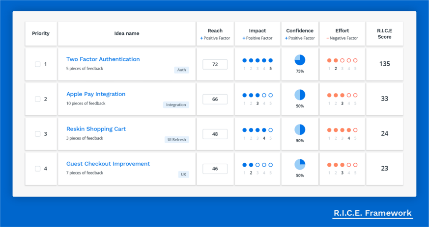 Eine erste und relativ pragmatische Annäherung ist das RICE Framework, das ursprünglich bei Intercom im Kontext der Produktentwicklung entstand. Das Akronym steht für Reach, Impact, Confidence (als positive Faktoren) sowie Effort (als negativer Faktor) und kann in diesem Zusammenhang wie folgt beschrieben werden: