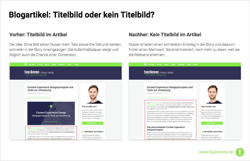 Wie du vielleicht schon gemerkt hast, habe ich keine Titelbilder mehr in meinen Artikeln. Bilder für die Linkvorschau in Social Media Beiträgen, ja, aber nicht mehr als “Standard” zu Beginn eines Artikels. Wieso? Weil sie an der Stelle einfach keinen konkreten Mehrwert beigetragen haben und die Nutzer im Grunde vom eigentlichen Content ferngehalten haben (ich erinnere an die Long-form Content Tests von oben).