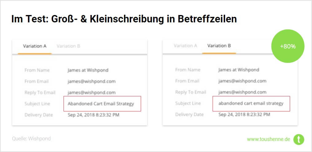 James Scherer hat sich in seiner damaligen Rolle als Content Editor bei Wishpond genau diese Fragen mit seinem Team gestellt und ihre Erfahrungen in einem Artikel aufbereitet: The Highest-Impact Email A/B Tests We've Ever Run. Die Ergebnisse sind teilweise überraschend, insbesondere den folgenden Test zur Groß- und Kleinschreibung finde ich spannend! Die Hypothese: Wenn wir Großbuchstaben in den Betreffzeilen entfernen, dann wirkt die E-Mail persönlicher und lässt sie so aussehen, als ob eine echte Person sie geschrieben und zu schnell auf "Senden" geklickt hat.