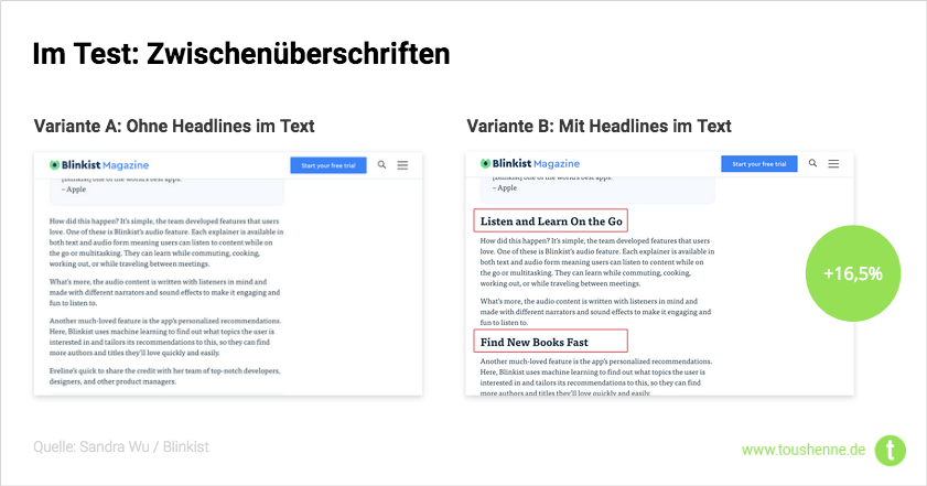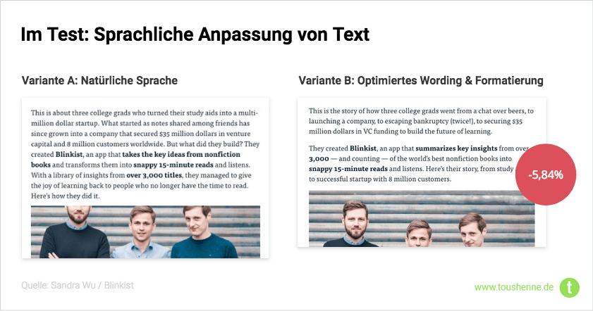 Ja, die Optik kann die Conversion Rate sowohl positiv als auch negativ beeinflussen. Mit einer Steigerung – wir nennen das Uplift – von 16,5 % war der Test bei Blinkst, bei dem sie primär mit Zwischenüberschriften experimentiert haben, extrem positiv (siehe Screenshot unten). Auch The Motley Fool konnte in Experimenten dahingehend einen signifikanten Uplift messen (siehe Punkt 4).