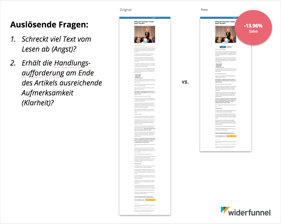- Erstelle das Konzept für deine Variante(n), führe den Test durch und werte ihn aus. Ich fasse diese drei Schritte hier einfach mal zusammen, denn eine detaillierte Erläuterung würde den Rahmen sprengen. Was wir brauchen, ist eine kontrastreiche Variante, bei der wir idealerweise nur eine konkrete Änderung testen, um nicht nur eine Korrelation sondern bestenfalls eine Kausalität nachweisen zu können. Das bezieht sich primär auf “Prinzipien” (Behavior Pattern) und nicht einzelne Text- oder visuelle Elemente. Beim Test von The Motley Fool ging es weniger um die Länge an sich, sondern die dadurch erzeugten Emotionen.