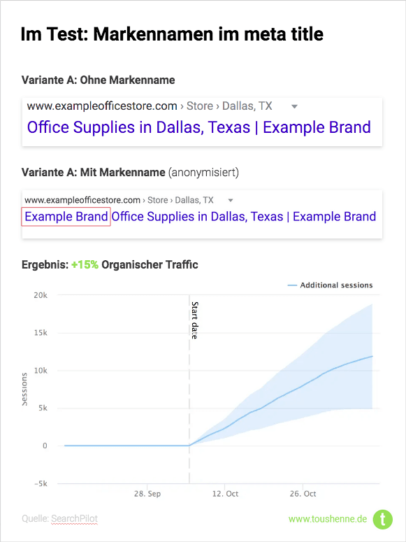 Das Team von SearchPilot (eine “SEO A/B-Testing Software”) hat in einem lokalen Kontext genau hiermit experimentiert und den Namen einer – zugegeben sehr bekannten, aber im Beispiel anonymisierten – Brand in die Seitentitel eingebunden – mit positivem Ergebnis auf die Klickrate, genauer gesagt 15 % Uplift.