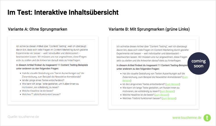 Der Gedanke dahinter: Helfen solche Elemente Nutzer:innen dabei, durch den Content zu navigieren, ihn einfacher zu verstehen und schneller an die gesuchten Informationen zu gelangen? Sofern du zum Beispiel hohe Absprungraten oder niedrige Scroll Rates und in Folge suboptimale Conversion Rates beobachtest (oder allgemein eine niedrige “Engagement Rate”, wie sie im neuen Google Analytics 4 genannt wird), können solche Content-Elemente die Nutzbarkeit deiner Artikel steigern und dafür sorgen, dass Nutzer:innen die gesuchten Informationen (einfacher/schneller) finden. In eine ähnliche Richtung gingen auch WiderFunnel mit ihren Tests für The Motley Fool (siehe Punkt 4) und mit der Veröffentlichung dieses Artikels läuft auch hier ein entsprechender Test.