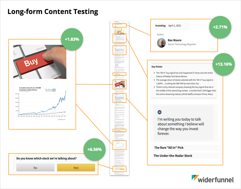 Wie die Tests aus dem vorherigen Beispiel belegen, ist die Relevanz ausschlaggebend für ein Grundinteresse der Nutzer:innen. Für James Flory, Director Experimentation Strategy, und seine Kollegen bei WiderFunnel war dieser erste Test aber vielmehr der Ausgangspunkt für weitere Experimente – mit Grafiken innerhalb der Artikel, visuell kontrastreich gestalteten Zitaten, Infoboxen und anderen Content-Elementen, die einerseits einen Mehrwert für Nutzer:innen darstellen, gleichzeitig aber auch den Text auflockern und die “Content Experience” abwechslungsreicher gestalten. Kumuliert haben sie dadurch bis heute einen Umsatz-Uplift von 26 % generiert. Iterativ kann long-form Content also immer effektiver werden – und mithilfe gezielter Experimente lernen wir auch, warum.