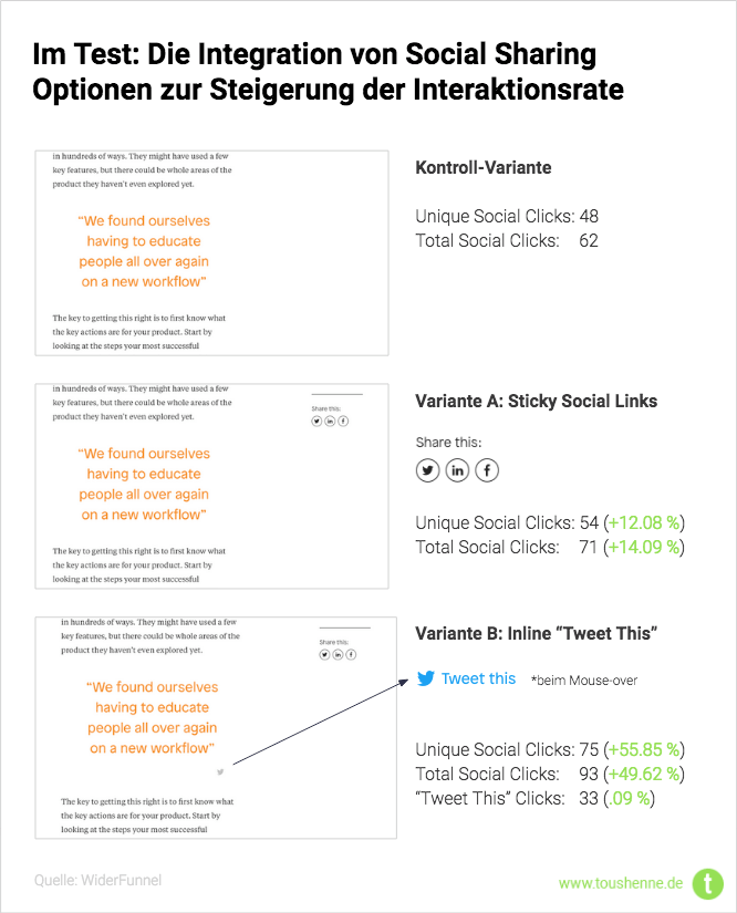 Gibt es jemanden, der sich diese Frage nicht regelmäßig stellt? Aber wie definieren wir “Interaktion” eigentlich? Für viele ist schon das Scrollen eine Interaktion, andere verstehen darunter eher das Kommentieren eines Beitrags oder das Teilen über Social Media. So auch für einen Kunden von WiderFunnel (anonymisiert), der in einem Test mit Blick auf das Angebot und die Gestaltung (einschließlich Positionierung) von Share Buttons eindeutig positive Ergebnisse erzielen konnte: