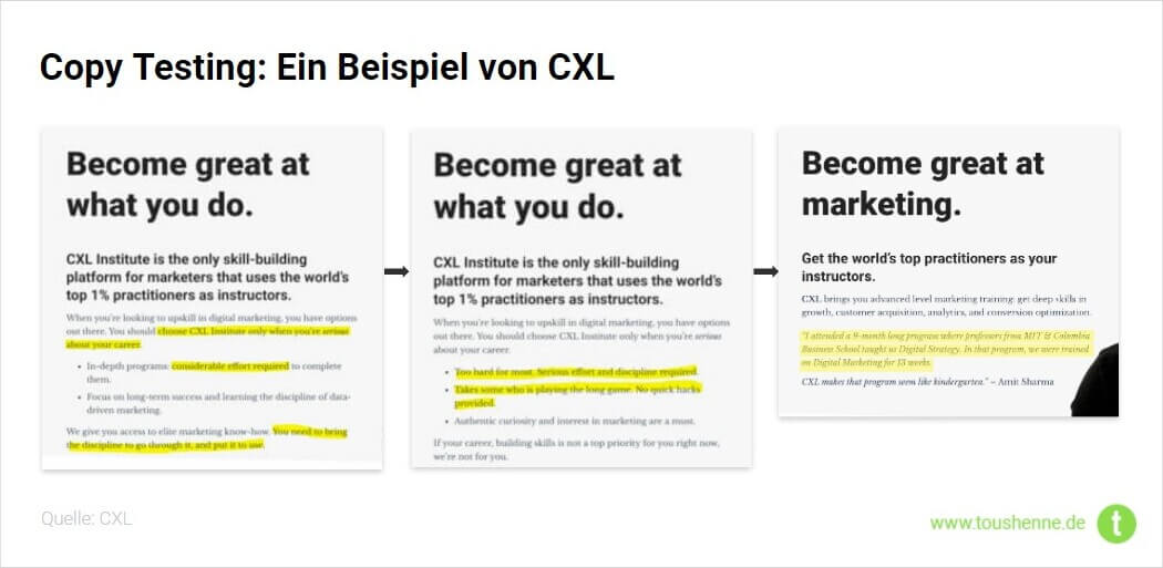 Ein anderes Beispiel für derartiges “Copy Testing” ist CXL, die im letzten Jahr den Pitch auf ihrer Startseite durch qualitatives User Feedback optimiert haben. Was vorher elitär und arrogant rüberkam (links im Bild, wird danach als hilfreiche Information zum notwendigen Arbeitseinsatz verstanden (Mitte). Und ein Blick auf die heutige Variante (ganz rechts im Bild unten) zeigt, dass sie sich inzwischen voll auf Social Proof in Form eines Testimonials verlassen.