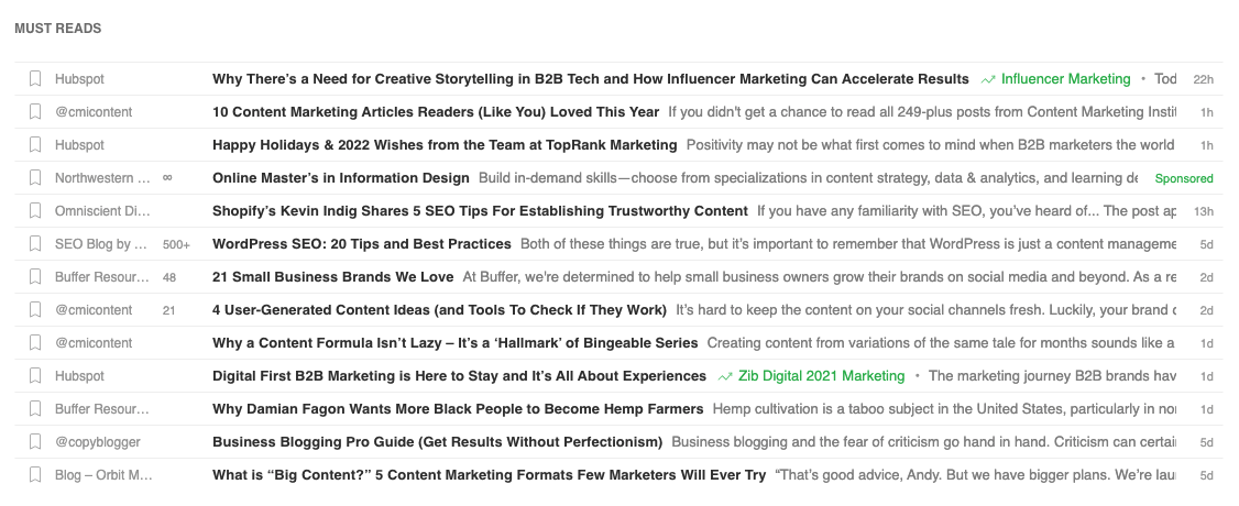 Der folgende Screenshot zeigt bspw. meinen Feedly-Stream von heute. Zeit, um alle Artikel zu lesen, habe ich nicht, also wo fange ich an? Vor allem der Titel ist ausschlaggebend dafür, ob ich eine Publikation überhaupt in die engere Auswahl nehme. Da dieser Feed bereits kuratiert ist, ist mir (!) zum Beispiel der Absender gar nicht mehr so wichtig – ich vertraue schließlich allen Quellen, sonst wären sie nicht in meinem Feed. Und ich persönlich habe Vorschaubilder ausgeblendet, da sie sich für mich (!) nicht als sinnvolles Kriterium zur Auswahl bewährt haben.
