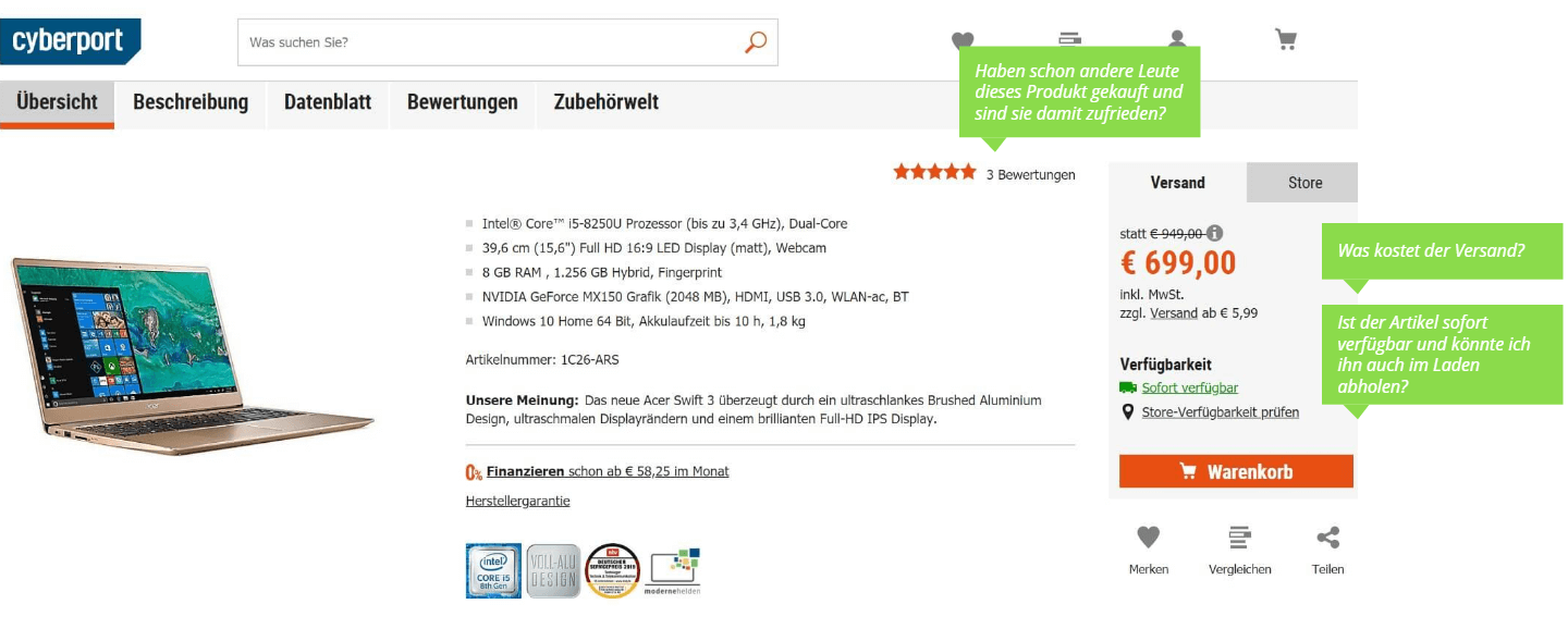 Unternehmen, die bloggen oder einen FAQ-Bereich pflegen, haben vielleicht dort schon die wichtigsten Fragen ihrer Kunden beantwortet. Falls nicht, ist die Landing Page ein guter Ort dafür – egal ob in Form von Links zu eben jenen Blogartikeln oder als direkt integrierte Fragen und (kurze) Antworten. Warum? Weil dadurch Bedenken beim Besucher ausgeräumt werden können. Im E-Commerce sehen wir genau deshalb oft Hinweise zu Rücksendebedingungen oder Liefergebühren; denn diese Fragen stellt sich der typische Kunde eben beim Kauf. Und es ist ein leichtes, sie kurz und knapp zu beantworten, so wie das beispielsweise Cyberport macht: