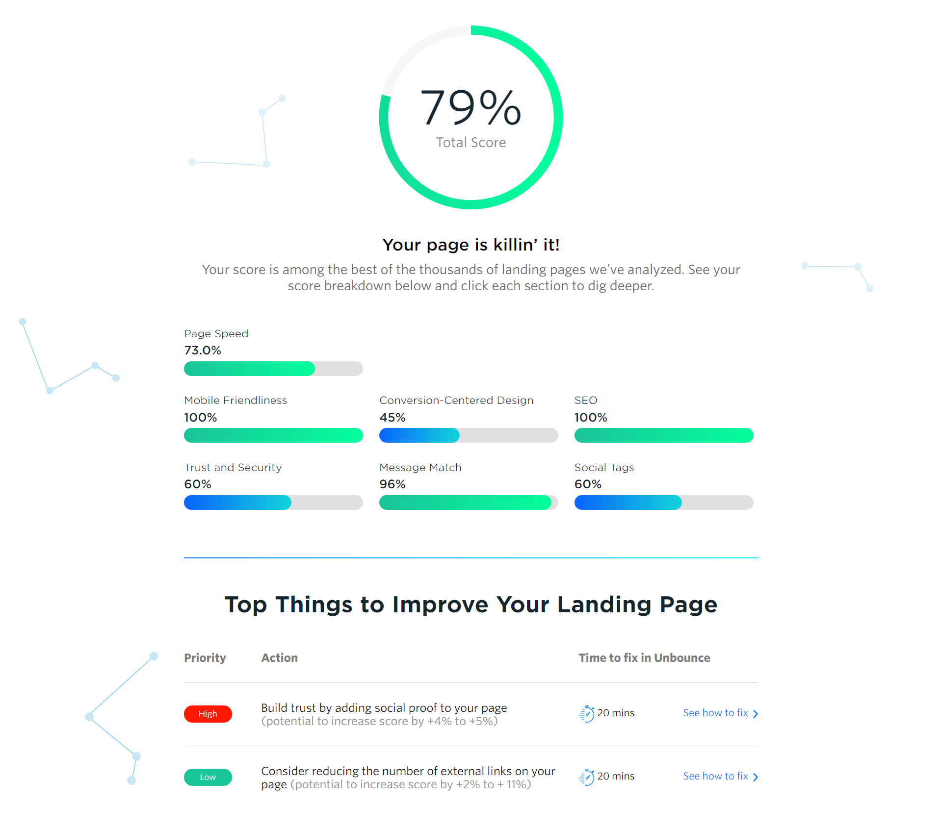 Für eine erste Bewertung kannst du den Landing Page Analyzer von Unbounce nutzen. Das Tool konzentriert sich auf die Optimierungspotenziale deiner Landing Page und misst neun verschiedene Kategorien: