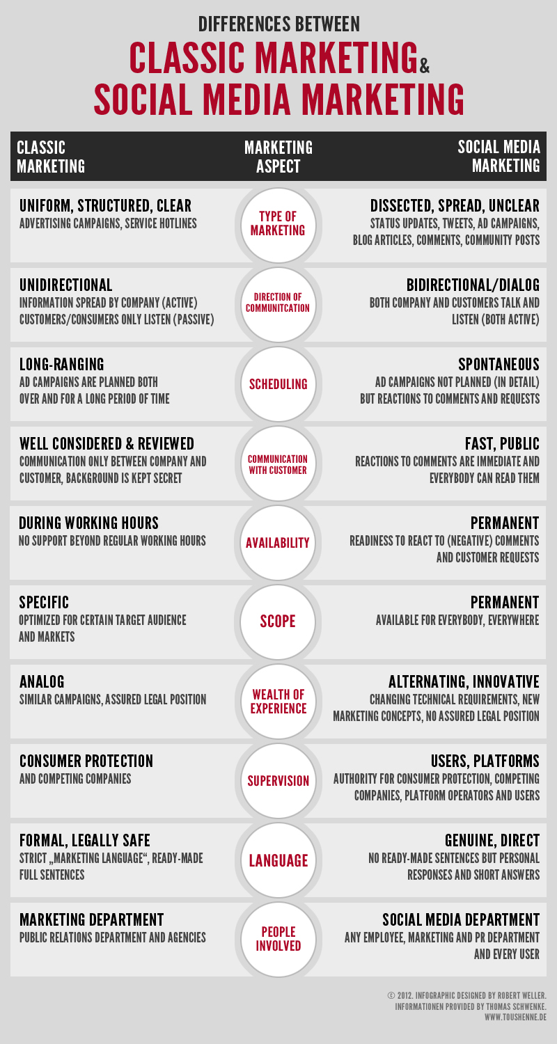 Social Media Marketing hingegen unterscheidet sich in seiner Art, der Planungs(un)sicherheit und v.a. der Geschwindigkeit. Echtzeit ist hier das Stichwort. Punktuelle Marketingmaßnahmen werden durch einen stetigen Fluss kleinerer Beiträge in Form von Tweets oder Facebook-Statusmeldungen abgelöst. Dass dabei das Proof-Reading, geschweige denn die rechtliche Prüfung auf der Strecke bleibt ist verständlich, es geht eher um einen authentischen Dialog mit Kunden.