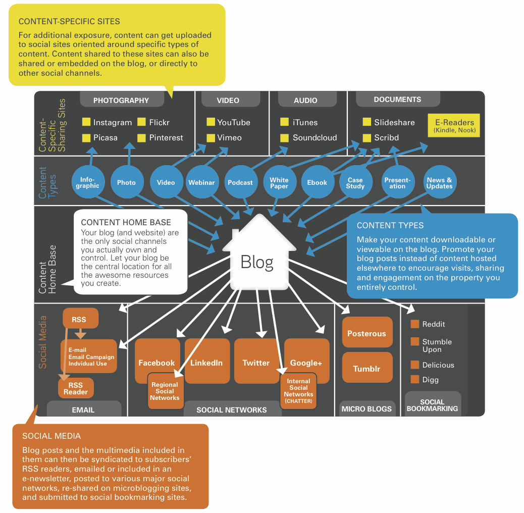 - Definiere deinen Content Hub und halte ihn strategisch fest. Dein Blog und deine Blogbeiträge sind und bleiben der Dreh- und Angelpunkt deines Content-Marketings. Dein Content Hub (Bild © Radian6/Salesforce) ist deine Owned-Media-Zentrale von der alle anderen Aktionen ausgehen und zu der, im Idealfall, auch alle Aktionen wieder zurückkommen.