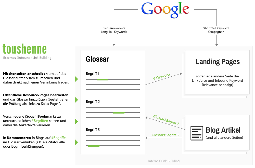 Schritt 3 ist die Verlinkung aus dem Glossar heraus und dadurch die Weitergabe des Link Juice. Landing Pages sind beliebte Einsatzorte solcher Links, da sie oft nur statischen Content beinhalten und nicht gerade durch Aktualität/Aktivität bei Google und Co. punkten können. - Externes Linkbuilding zum Glossar