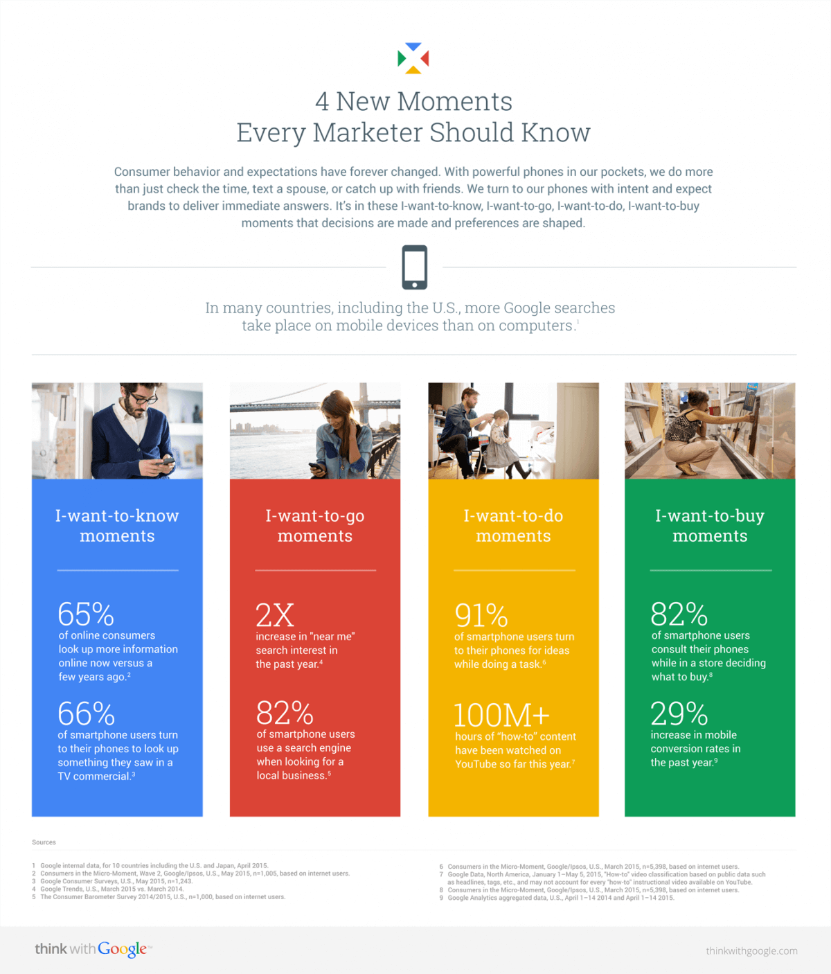 „Consumer behavior and expectations have forever changed. With powerful phones in our pockets, we do more than just check the time, text a spouse, or catch up with friends. We turn to our phones with intent and expect brands to deliver immediate answers. It’s in these I-want-to-know, I-want-to-go, I-want-to-do, I-want-to-buy moments that decisions are made and preferences are shaped“ (Quelle: thinkwithgoogle.com/PDF).
