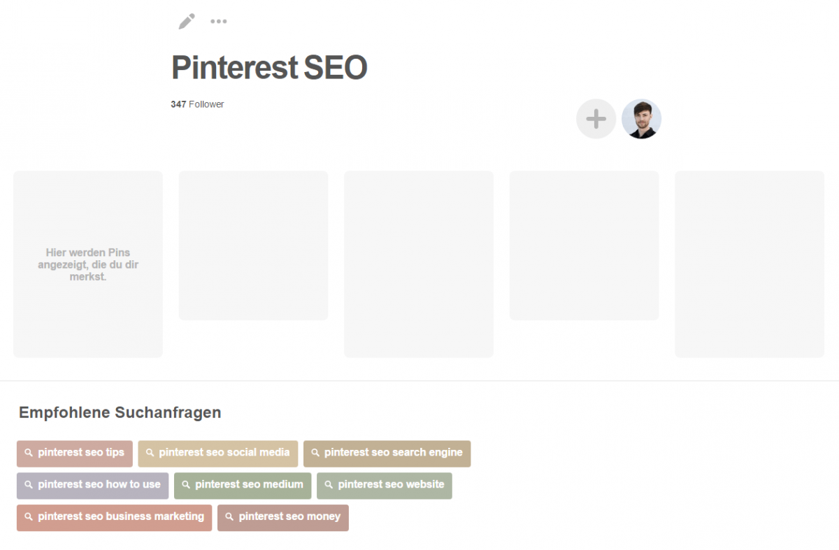 Wenn du deine Keywordliste im klassischen Sinne erstellt hast, dann erstelle anhand dieser einfach mal ein neues Board. Pinterest spuckt dann nämlich ähnliche/relevante Vorschläge aus, die du entweder für eigene Boards oder für Beschreibungen einsetzen kannst (siehe Screenshot).