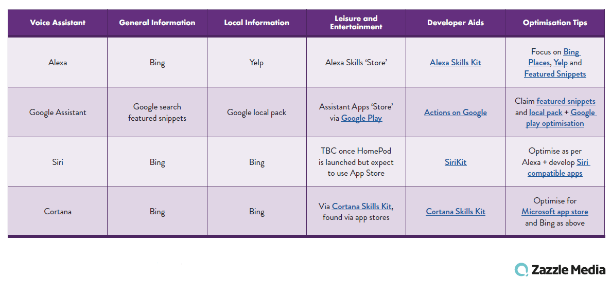 Wir sprechen in Bezug auf Voice Search hauptsächlich über Google, aber Microsofts Suchmaschine Bing gewinnt im Verborgenen immer mehr Marktanteile. Denn Sowohl Siri als auch Alexa und Facebook greifen auf Bing-Daten zurück! Simon Penson von Zazzle Media hat hierzu eine praktische Übersicht erstellt: