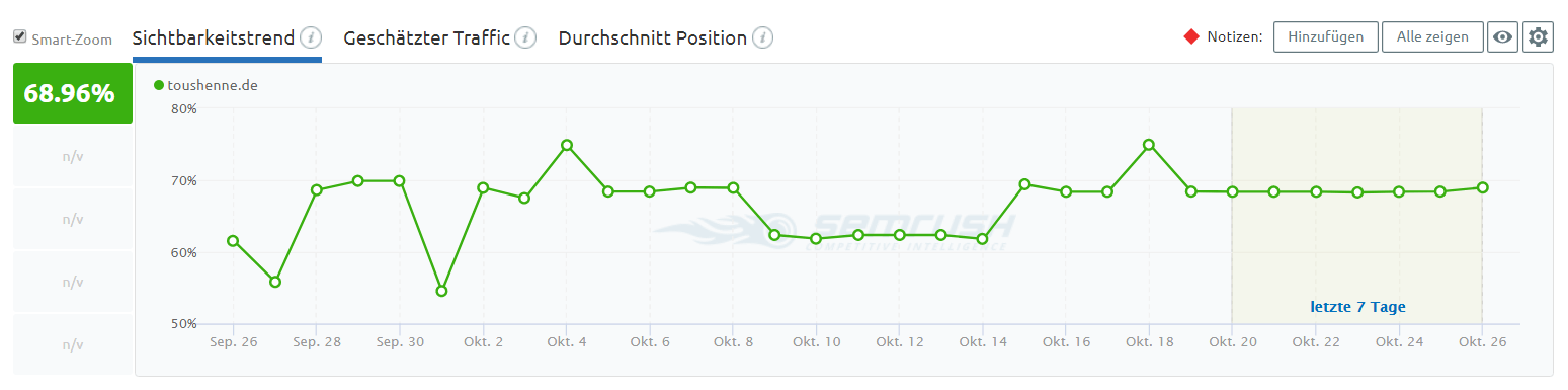 Durch die Domain-Analyse sammelst du sozusagen deine “Benchmark Daten”, sodass du einen Referenzpunkt für deine Optimierungsmaßnahmen hast. Du erhältst in diesem Bereich Informationen über den momentan generierten organischen Traffic (inkl. Tendenz), die Anzahl deiner Backlinks sowie eine Übersicht der Keywords, mit denen du in den Suchergebnissen rankst, samt einer Positionsverteilung.
