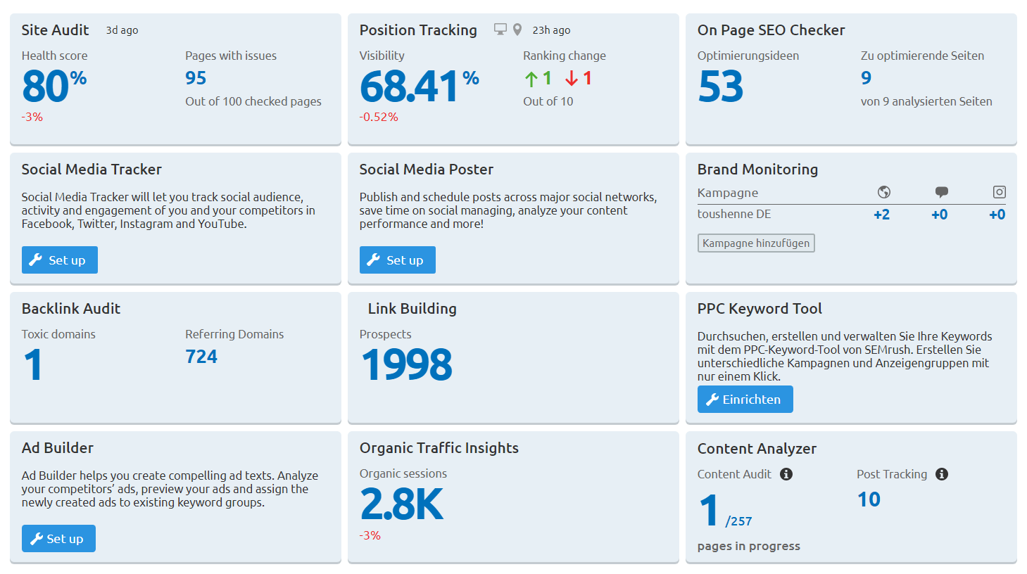 - Social Media Tracker & Poster – Wie bereits gesagt, nutze ich SEMrush vor allem für SEO-Zwecke. Zwar kannst du über SEMrush auch auf den großen Social Media-Plattformen publizieren und deine Audience dort tracken, für mich stellt diese Funktion aber keinen zusätzlichen Mehrwert da (ich bevorzuge Buffer).